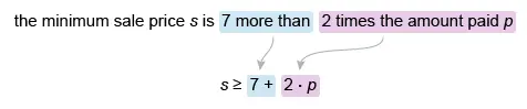 A certain thrift store uses a guideline to set sales prices for gently used designer items they've purchased. The recommended minimum sale price of any thrift item, s dollars, is 7 more than 2 times the amount paid for that item, p dollars. Which inequality shows the possible values of s ?