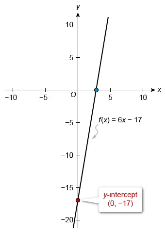 Note: It is also possible to compare the function f(x) = 6x − 17 to slope-intercept form f(x) = mx + b to see that the value of the y-coordinate of the y-intercept is −17.
