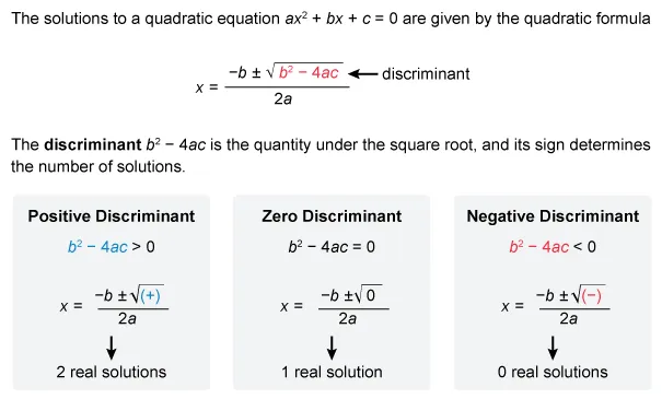 A quadratic equation may have 0, 1, or 2 solutions. It is possible to analyze the number of solutions to a quadratic equation from the discriminant.