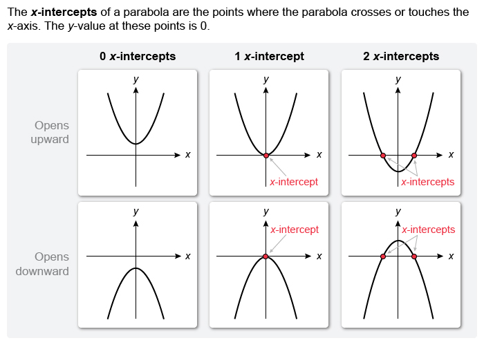 The real solutions to a quadratic equation in the form 0 = ax2 + bx + c correspond to the x-intercepts on the graph of y = ax2 + bx + c because x-intercepts have a y-value of 0.