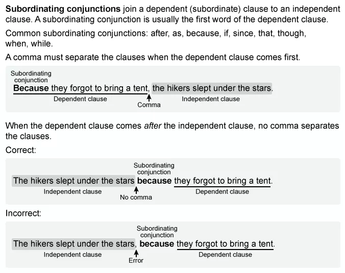 Look for subjects and verbs to identify clauses in a sentence. When a clause at the beginning of a sentence doesn't express a complete thought, choose the answer with a comma after it.